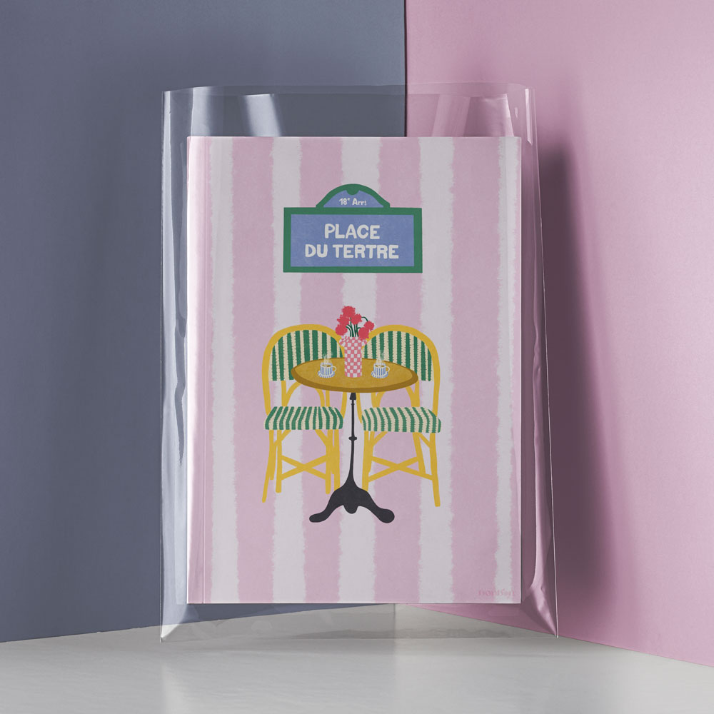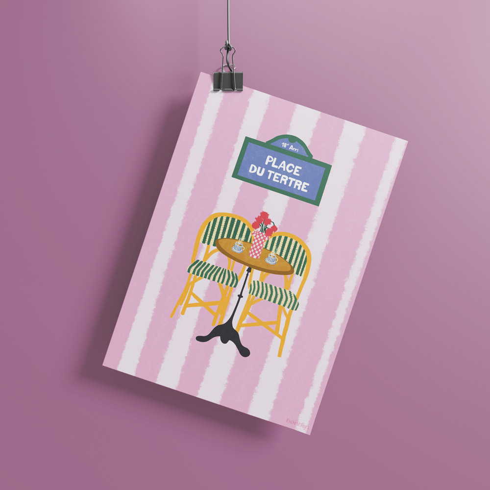 L’Affiche colorée « Place du Tertre » : Le charme intemporel des terrasses animées de la place du Tertre à Paris, capturant l’ambiance vivante et artistique de Montmartre.